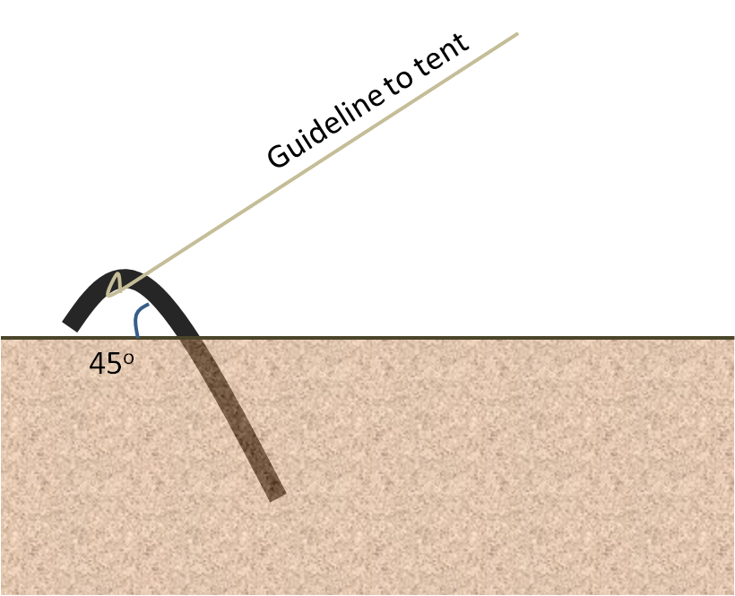 Step 3. Tie the guideline at each end of the tarp to its peg. If there are two of you, stand at opposite corners, spread the tarp apart to form half its shape and push the peg into the ground simultaneously. Note that the end of the peg that is pushed into the ground is pointing towards the center of the ridge line at about 45 ° from the ground. The pegs should be pushed into the ground to the extent that only the curved hook at the top is exposed. This is to ensure maximum anchorage. Switch to the other corners and repeat to get the A-shape. Adjust the angle of the tension applied to the tarp from the guideline such that there is no crease or fold on the tarp![]()